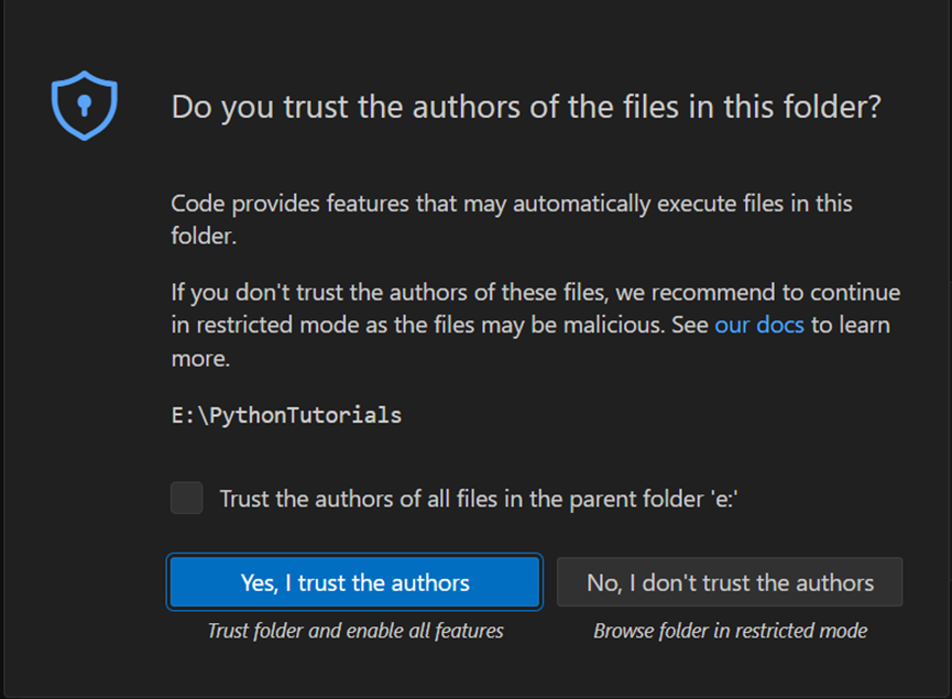 打开文件夹后,复选"Trust the authors of all files in the parent folder 'e':,点击Yes, I trust the authors(是的,我信任该作者)。