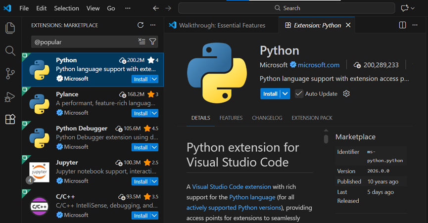 安装过程会带动Python, Pylance, Python Debugger系列Extension一道安装。
