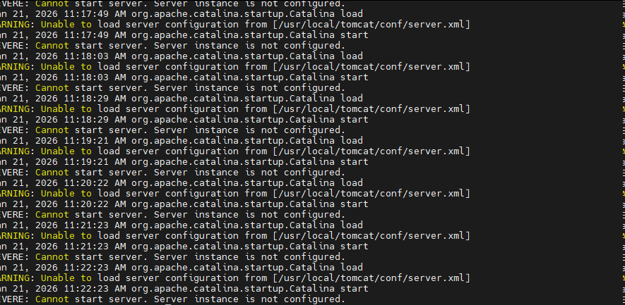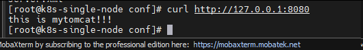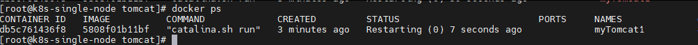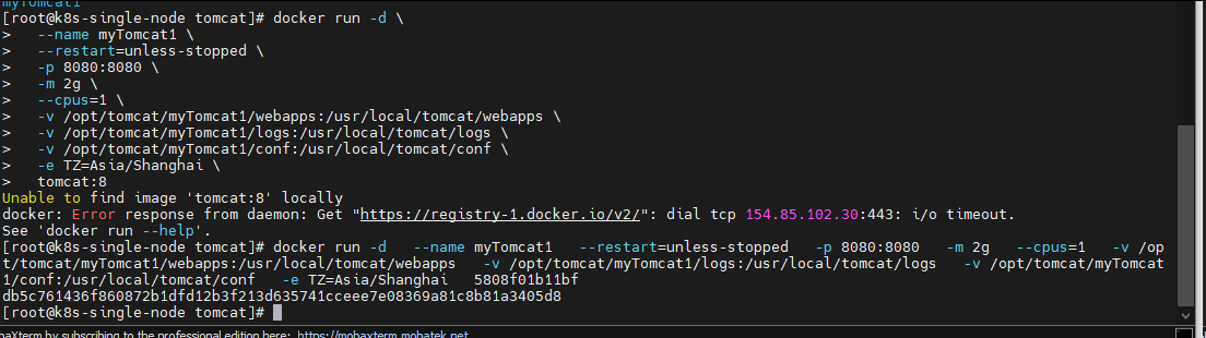 [root@k8s-single-node tomcat]# docker run -d --name myTomcat1 --restart=unless-stopped -p 8080:8080 -m 2g --cpus=1 -v /opt/tomcat/myTomcat1/webapps:/usr/local/tomcat/webapps -v /opt/tomcat/myTomcat1/logs:/usr/local/tomcat/logs -v /opt/tomcat/myTomcat1/conf:/usr/local/tomcat/conf -e TZ=Asia/Shanghai 5808f01b11bf