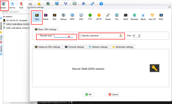 4.3、下面点击session,点击ssh,第一个框是板子的ip地址,第二个是给板子取的名字