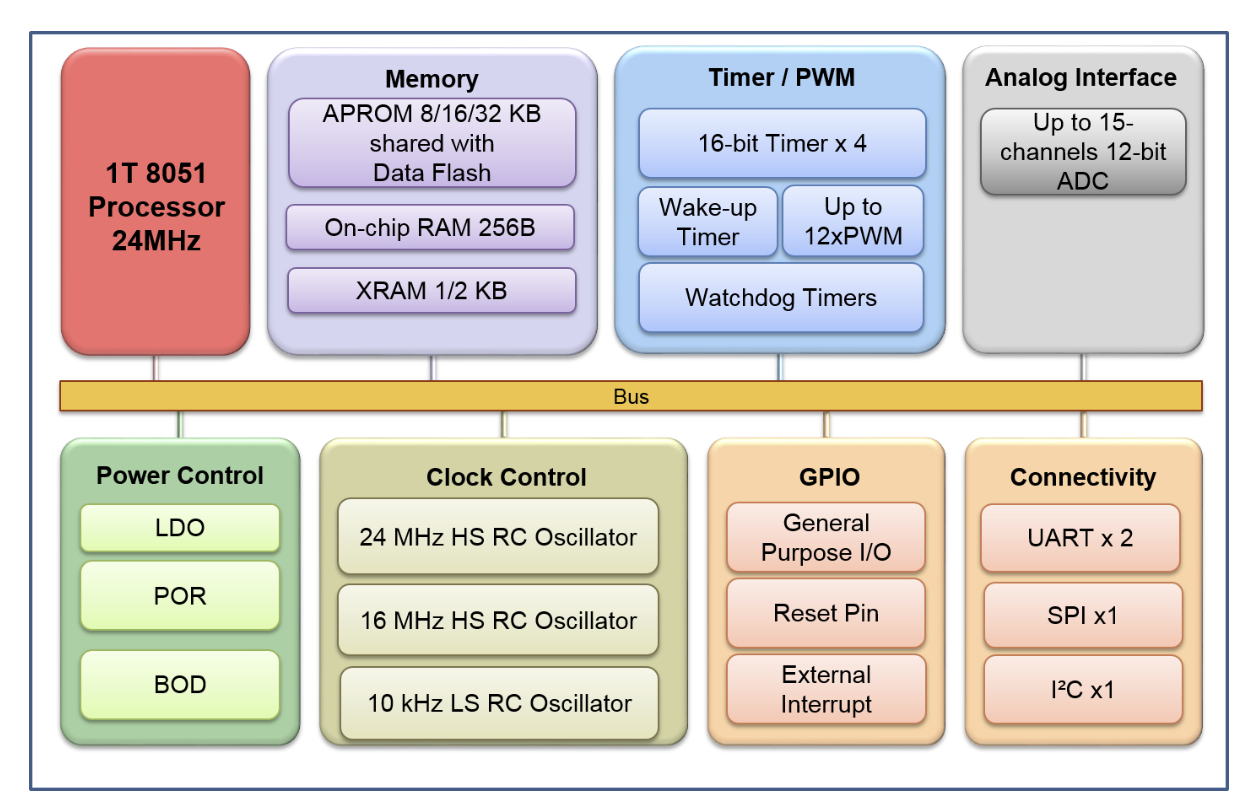 MS51FB9AE 带有 Flash 的增强型 8 位 8051 内核微控制器(1 T 工作模式),工作频率最高至 24 MHz,支持电压工作范围 2.4 V 至 5.5 V,工业级工作温度: - 40 ℃ 至 105 ℃,并且包含 16 K 字节的 Flash 以及一个额外 1 K 字节片上辅助 RAM ( XRAM ),备有丰富的外设,如 18 个通用 I / O、定时器、看门狗定时器、2 组 UART、1 组 SPI、1 组 I²C、6*16-bit 路 PWM 及 8 路 12 位 ADC等。提供 TSSOP20 封装。