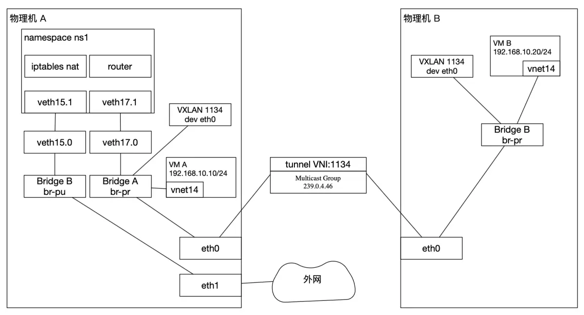 | 物理机 B | ubuntu 1804 | --- | br-pr | --- | eth0 | --- | veth17.0 veth17.1 | vm-b |