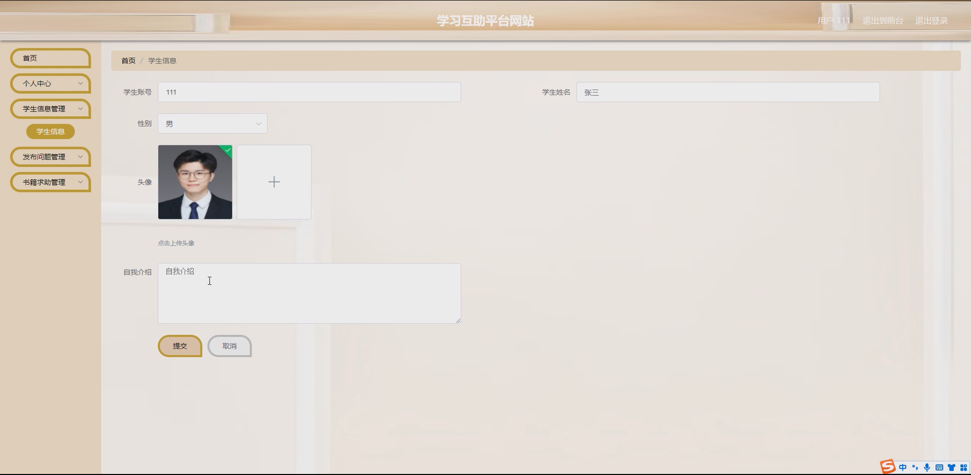 学生模块:实现学生的注册、登录、个人信息修改、密码重置等功能,区分普通学生和系统管理员用户,分配不同的操作权限;普通学生可管理个人信息,管理员可管理所有学生账号。