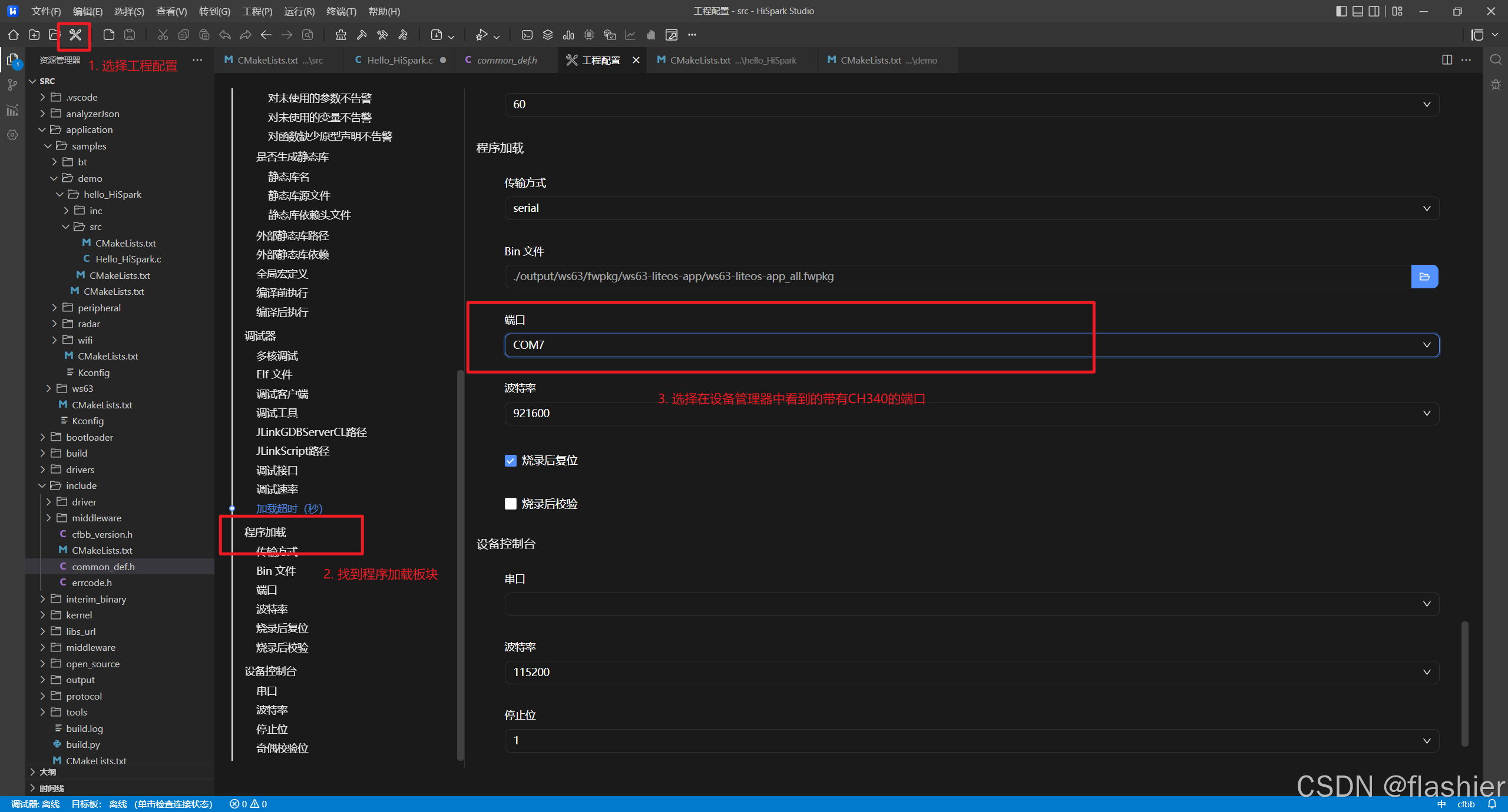 - 点击工程配置,找到程序加载板块,修改端口为在设备管理器中看的带有