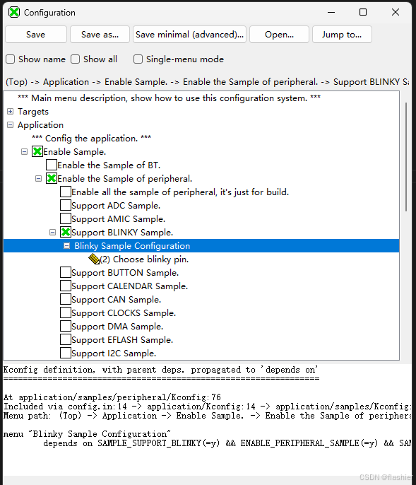 ```c config SAMPLE_ENABLE bool prompt "Enable Sample." default n help This option means support Samples. if SAMPLE_ENABLE osource "application/samples/Kconfig" endif ``` - config SAMPLE_ENABLE:定义一个名为SAMPLE_ENABLE的配置选项 - osource "application/samples/Kconfig":如果SAMPLE_ENABLE被启用,则加载路径application/samples/Kconfig中的配置选项 -