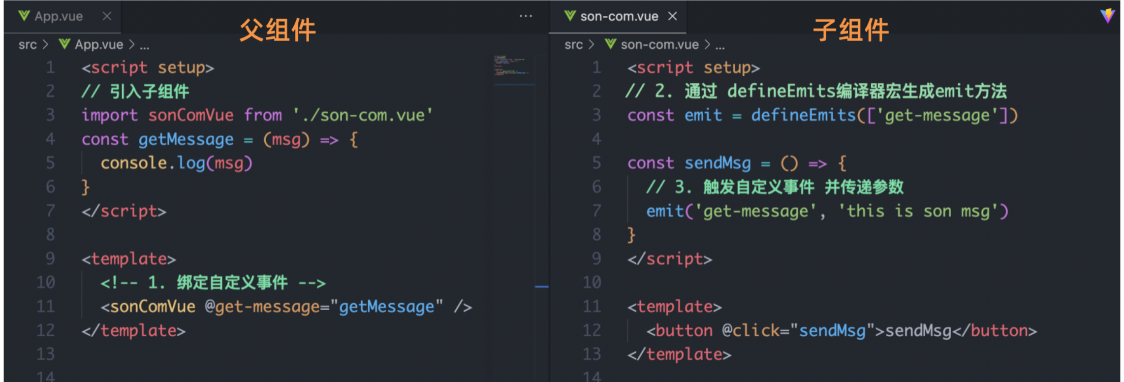 - 子组件内部通过 emit 方法触发事件