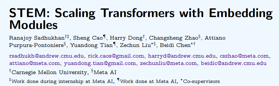 这里的新一代架构是指Memory-Augmented Transformer, 顾名思义,为现有的Transformer注入记忆机制.记忆是DeepSeek那篇Nagram 主要sale的点,STEM并没有明确提这个概念,但是不约而同地采用了Learnable embeddings为 transformer注入知识;