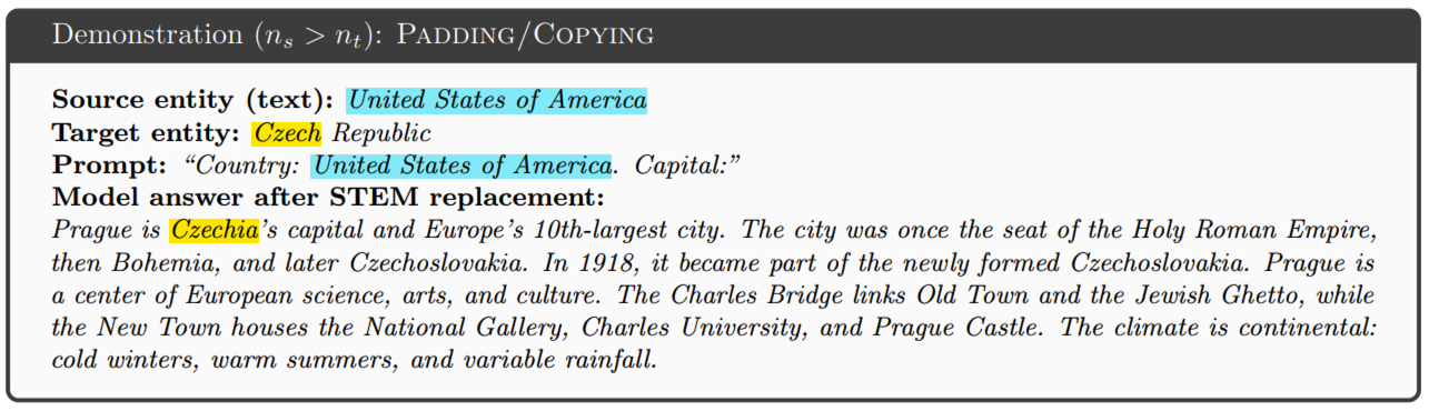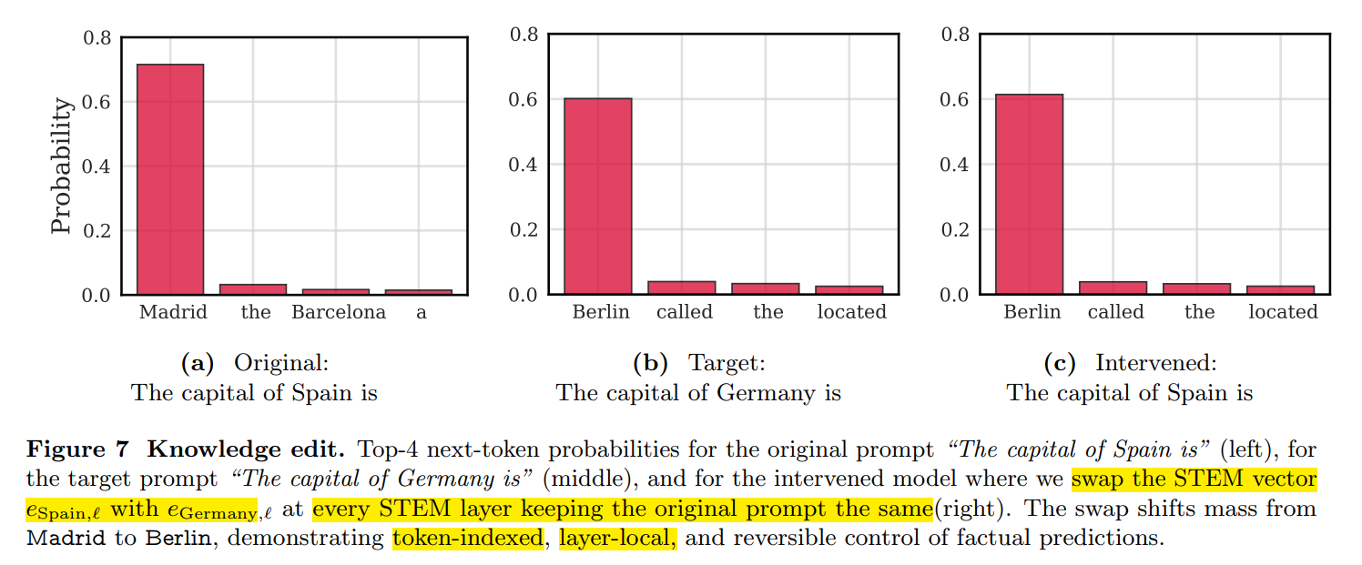 通过修改每一个STEM层中具体token,可以控制输出;输入都是一样的'The captital Spain is ';