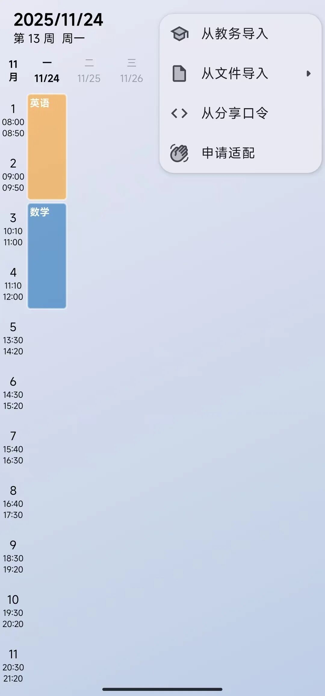 除了手动添加,软件还支持导入现有课程表。在设置里能灵活调整上课时间、课程表显示样式等参数,满足不同学校的作息安排。