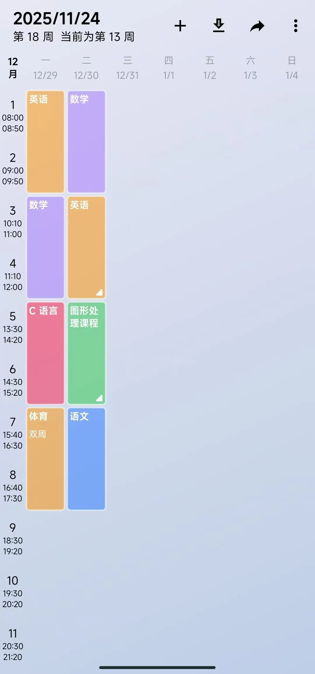 软件支持手动添加课程,还能用不同颜色区分各类课程,设置上课时间段等功能。长按已添加的课程就能进入编辑状态,随时调整课程信息,特别方便课程调整频繁的学生党。