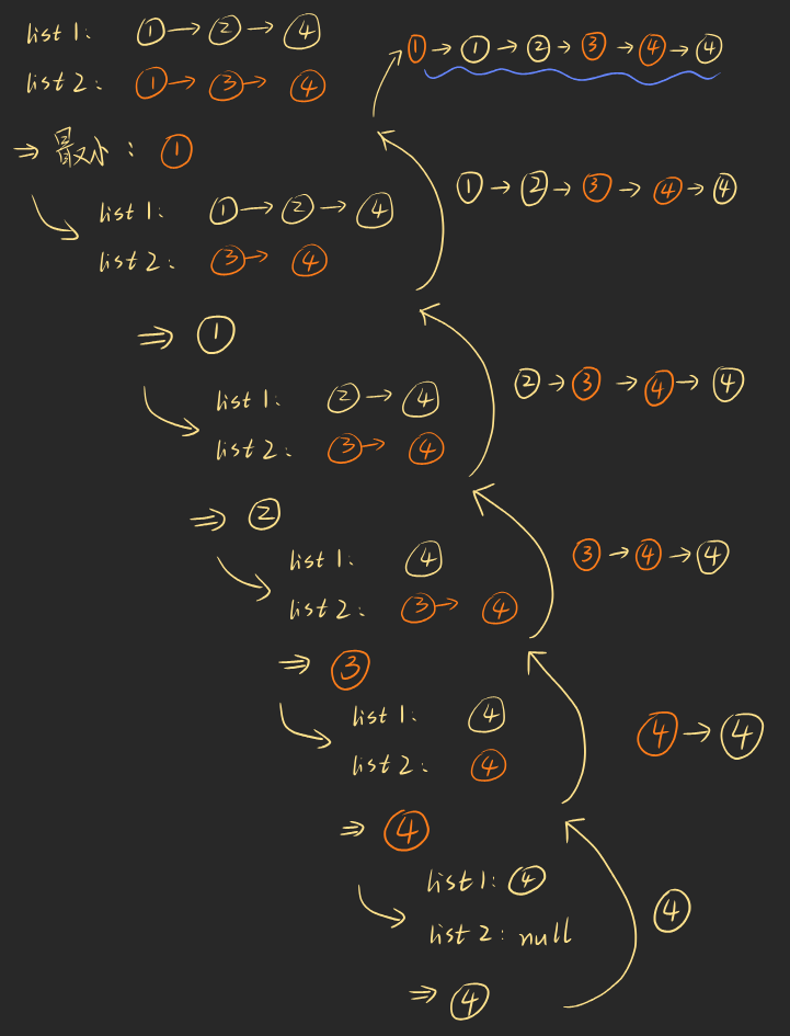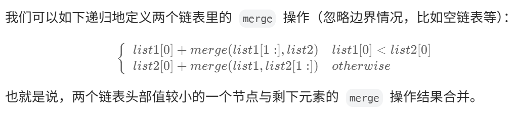假设两个链表都不为空,那么两个链表拼接所得的链表可以看作:先选出最小值,并把该结点排除在外,再使剩余的链表合并....