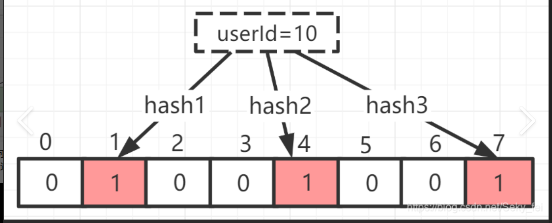 当我们需要判断一个元素是否存在于布隆过滤器的时候,会进行如下操作: