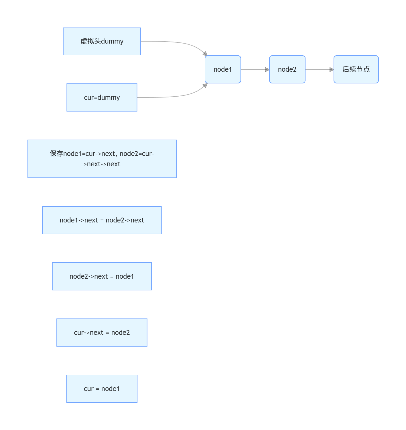 - 仅做了 JS 语法适配,变量名(dummy/cur/node1/node2)和执行流程和你的 C++ 代码一一对应;