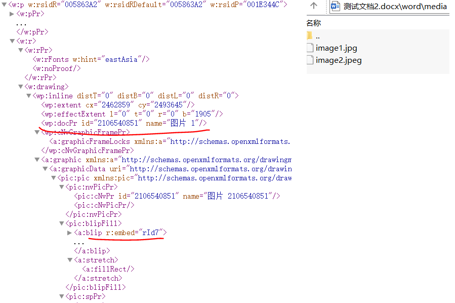 OpenXml中使用ImagePart类保存Word文档内所有图片的二进制数据,为文档中的图片元素提供引用目标。采用解压缩软件打开Word文档,其内的word\media文件夹中保存图片文件,然后在word文件夹的document.xml文件内引用图片信息,如下图所示。