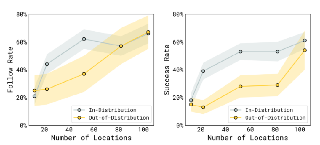 ****第二组评估实验:****在不同场景数量数据上训练后,PI评估模型对分布内及分布外物品的语言指令遵循能力。
