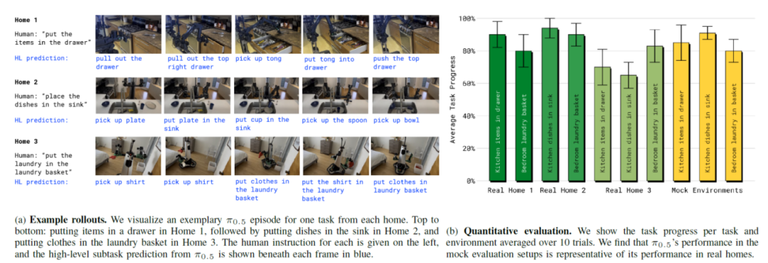 在三处未纳入训练集的真实住宅环境中,PI对三间厨房和三间卧室开展π0.5评估实验,测试任务包括"物品放入抽屉""衣物放入洗衣篮"及"餐具放入水槽"。实验结果表明,π0.5在这些完全陌生的真实住宅环境中,均能成功完成上述任务。