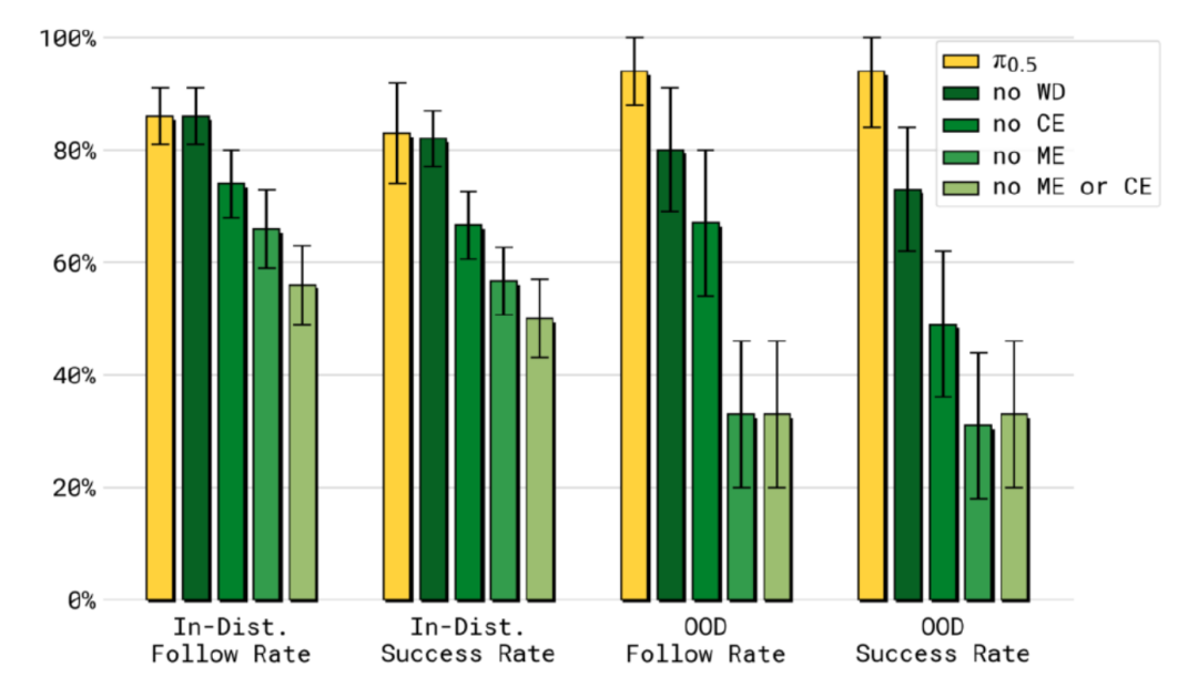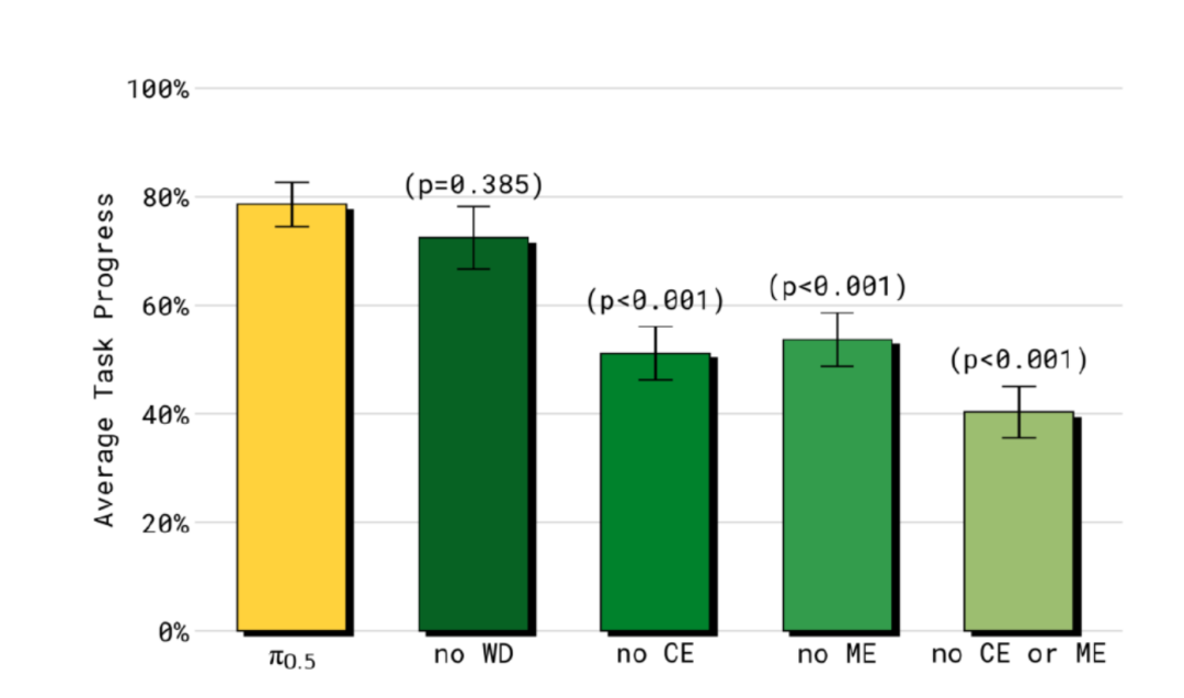 上述三项措施共同构成"知识隔离" 的训练范式。实验证明,该方法能够在为VLM嫁接连续动作专家的同时,完整保留其基于大规模网络数据习得的预训练知识,最终实现训练高效、语义泛化能力强、运动控制精准的三重目标。