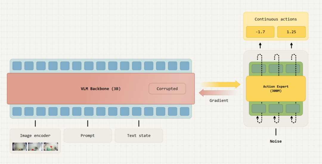 备注: 在预训练视觉语言模型(VLM)骨干网络上简单添加动作专家模块以构建视觉语言动作模型(VLA)时,动作专家传递至 VLM 骨干网络的梯度,会对骨干网络中的特征表征产生不利影响。