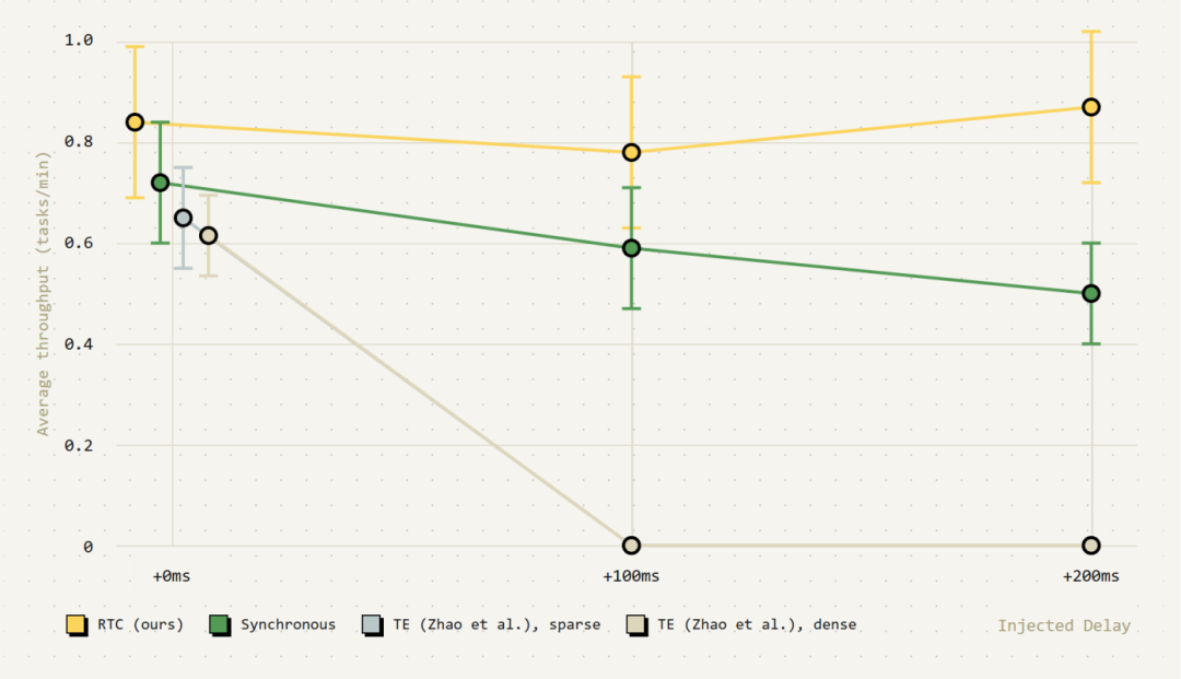 推动实时分块研究的另一动机 ,是应对未来模型可能产生更高的推理延迟。无论是由于模型规模扩大、云端推理部署,还是适配不同机器人硬件,延迟增加都将成为关键挑战。因此,PI进一步研究了在人为注入 +100 毫秒 与 +200 毫秒额外延迟时模型的性能变化。