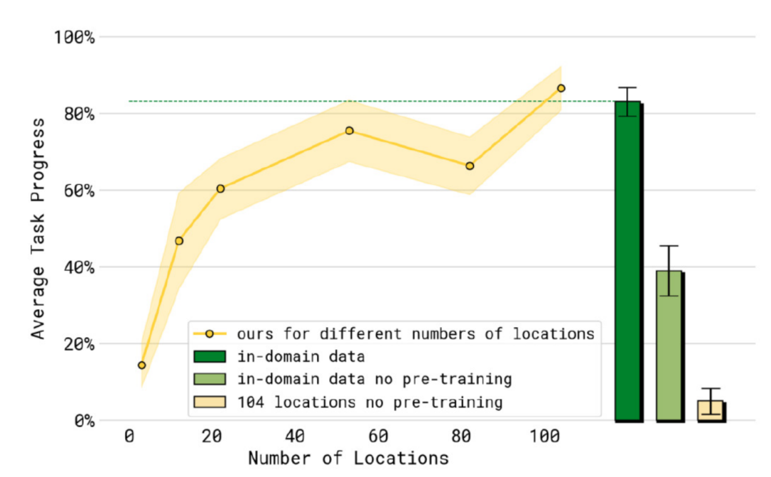 PI通过调整移动机器人操作臂数据(MM)的环境数量(分别采用3个、12个、22个、53个、82个及104个场景的数据开展训练),以此评估环境数量对泛化能力的影响。