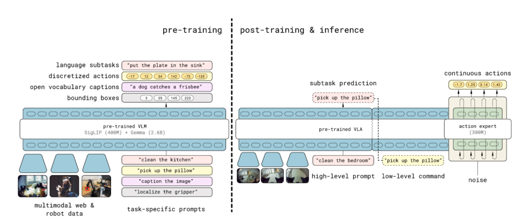 π0.5采用分层架构设计,整体上遵循"预训练 - 后训练(专项微调)- 分层推理"的流程,兼顾长时段任务推理与多层次知识融合的能力。