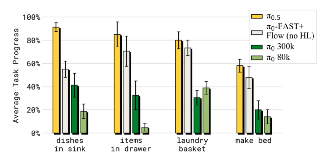 PI将π0.5与原始π0VLA模型及π0的改进版本(记为π0-FAST+Flow)进行对比。为保证对比的公平性,所有模型均使用相同的跨形态机器人训练集,且训练步数大致相当。