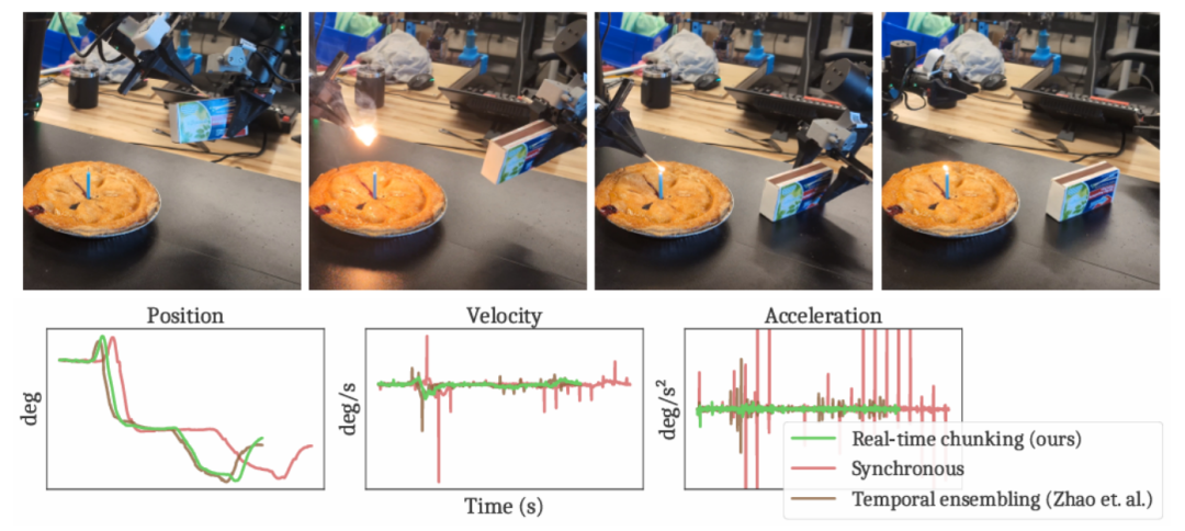 备注: 上图 ------ 实时分块(RTC)技术使机器人能够完成如划火柴等高灵巧度的动态任务------即使在推理延迟超过 300 毫秒(该延迟占模型预测时域的 30% 以上)的情况下仍可稳定执行。**下图 ------**与同步推理相比,RTC 完成相同机器人动作的速度提升 20%,且比包括时间集成法在内的所有同类竞争方法更平稳。图中所示的位置、速度和加速度数据对应单臂肩关节,取自真实自主划火柴任务前10秒的实际运行数据。