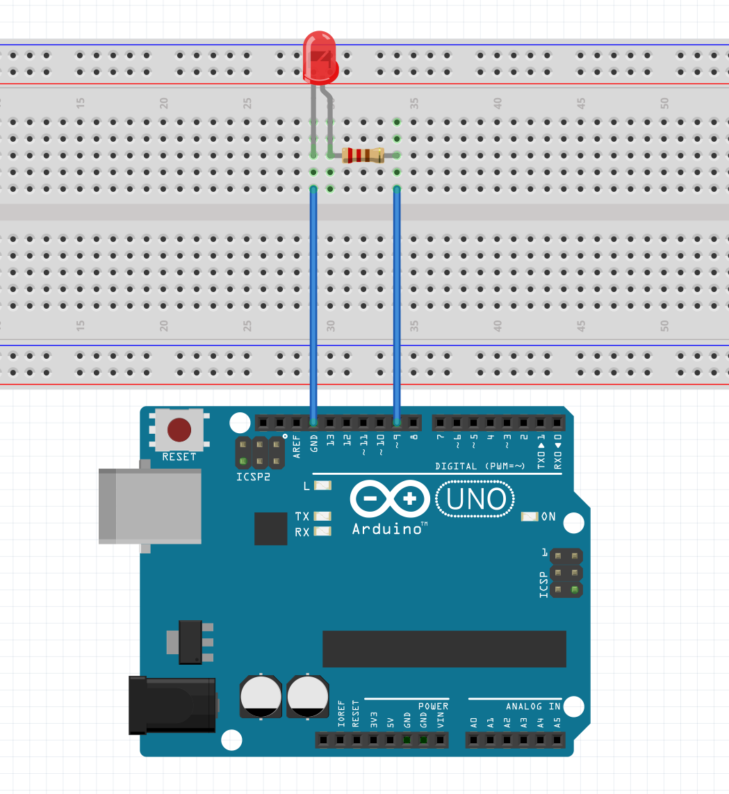 | 9(~PWM 引脚) | LED 正极 | LED 正极接 9 脚,负极串 220Ω 电阻接 GND |