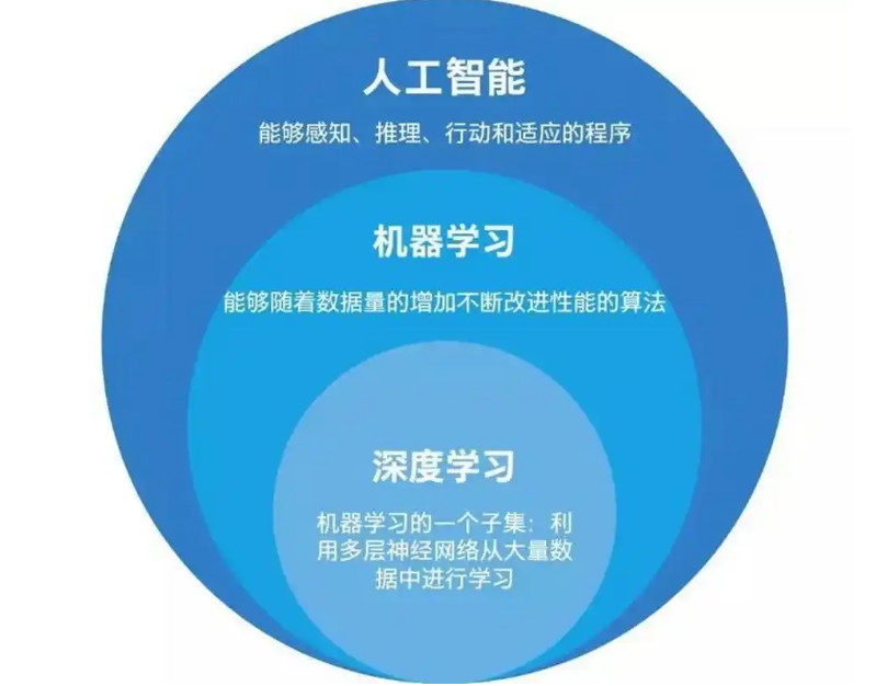 | 人工智能 (AI) | 机器展现智能行为 | 只要机器表现得像人一样聪明。 | 自动空调、早期国际象棋程序 | 最外层大框架 |