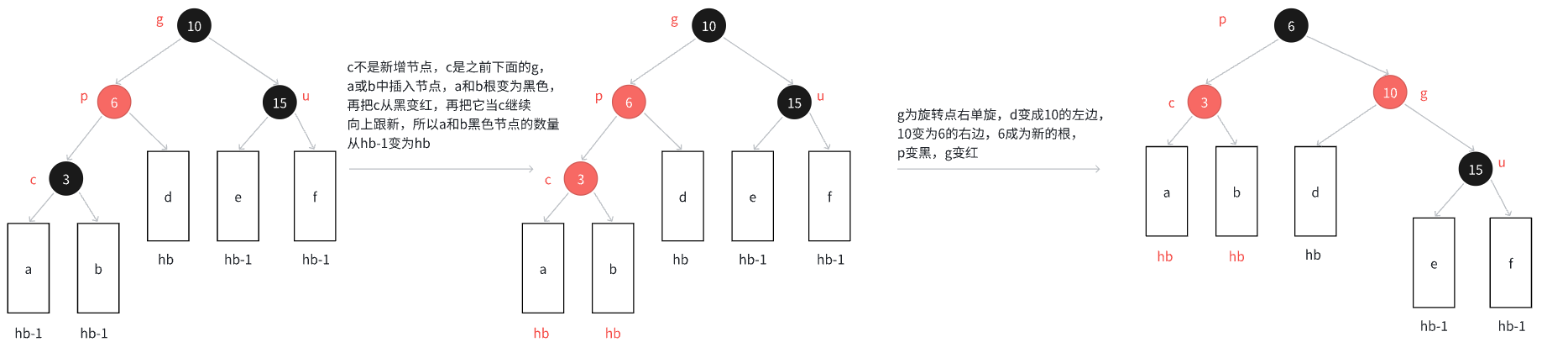 如果p是g的左,c是p的左,那么以g为旋转点进行右单旋,再把p变黑,g变红即可。p变成这棵树新的跟,这样子树黑色节点的数量不变,没有连续的红色节点了,且不需要向上更新,因为p的父亲是黑色节点