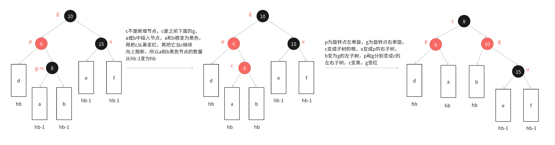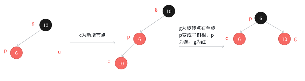 - c为红,p为红,g为⿊,u不存在或者u存在且为⿊,u不存在,则c⼀定是新增结点;u存在且为⿊,则 c⼀定不是新增,c之前是⿊⾊的,是在c的⼦树中插⼊,符合情况1,变色将c从⿊⾊变成红⾊,更新上来的