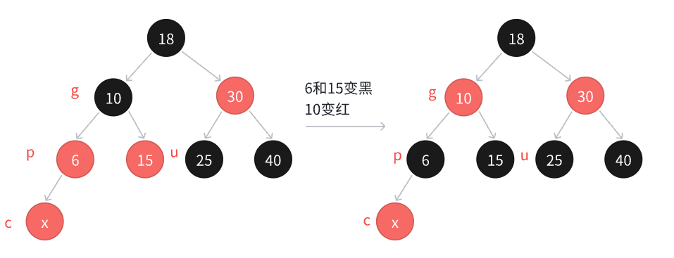 - 因为p和u都是红⾊,g是⿊⾊,把p和u变⿊,左边⼦树路径各增加⼀个⿊⾊结点,g再变红,相 当于保持g所在⼦树的⿊⾊结点的数量不变,同时解决了c和p连续红⾊结点的问题,需要继续往上更新是因为g是红⾊,如果g的⽗亲还是红⾊,那么就还需要继续处理;如果g的⽗亲是⿊⾊,则处理结束了;如果g就是整棵树的根,再把g变回⿊⾊。