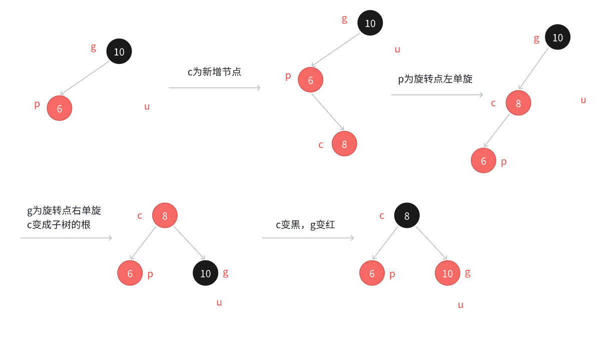 如果==p是g的左,c是p的右,那么先以p为旋转点进⾏左单旋,再以g为旋转点进⾏右单旋,再把c变⿊,g变红即可。==c变成课这颗树新的根,这样⼦树⿊⾊结点的数量不变,没有连续的红⾊结点了,且不需要往上更新,因为c的⽗亲是⿊⾊还是红⾊或者空都不违反规则。