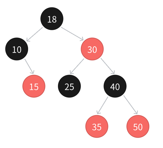 - 规则3:如果一个节点是红色的,则它的两个孩子节点必须是黑色的,也就是说任意一条路径不会有连续的红色节点