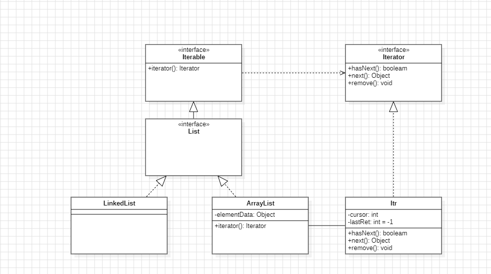 具体聚合和具体迭代器:ArrayList:实现,我们知道它的底层是Object[]; 具体迭代器是一个内部类Itr 。简化版代码如下