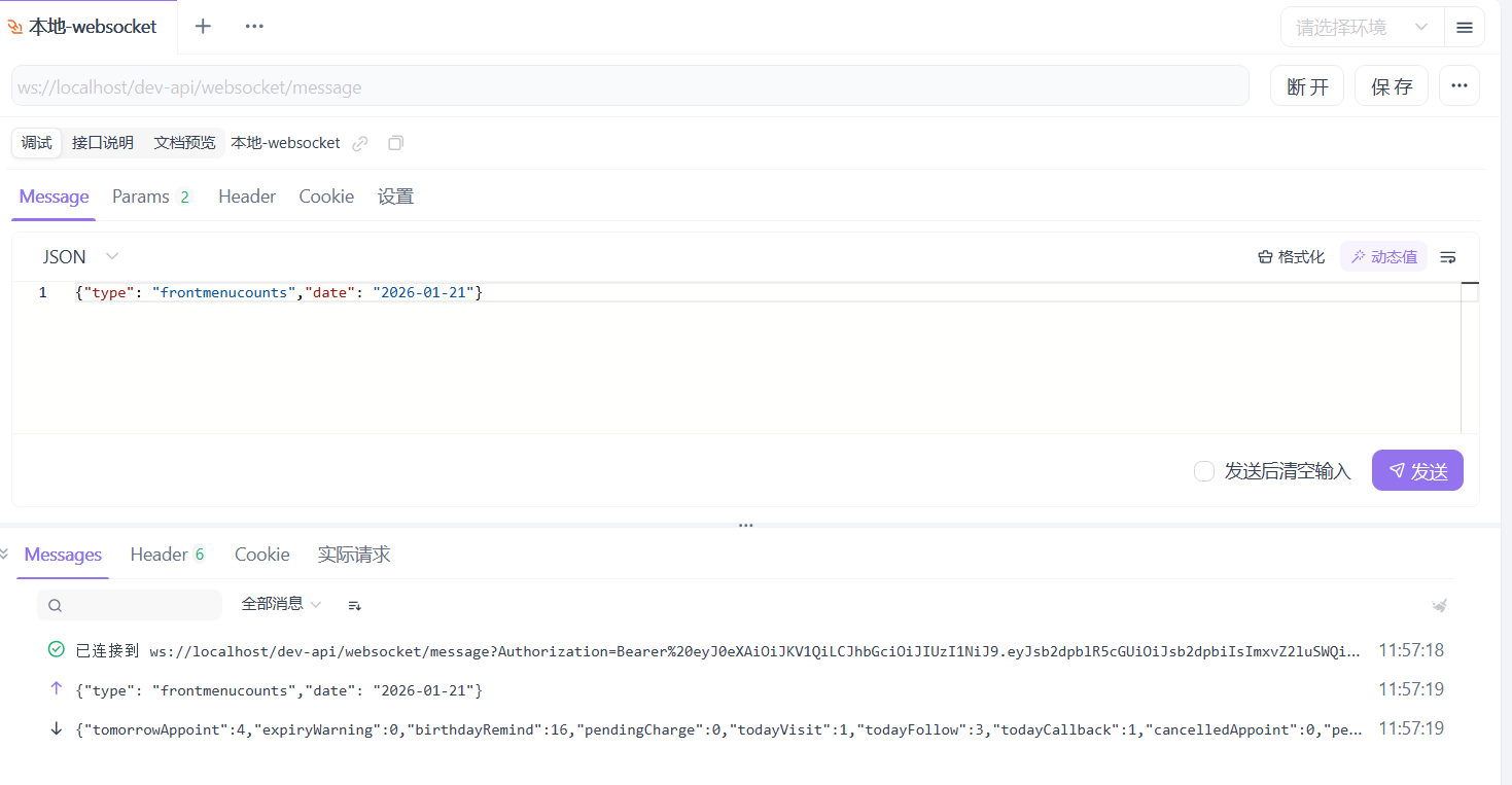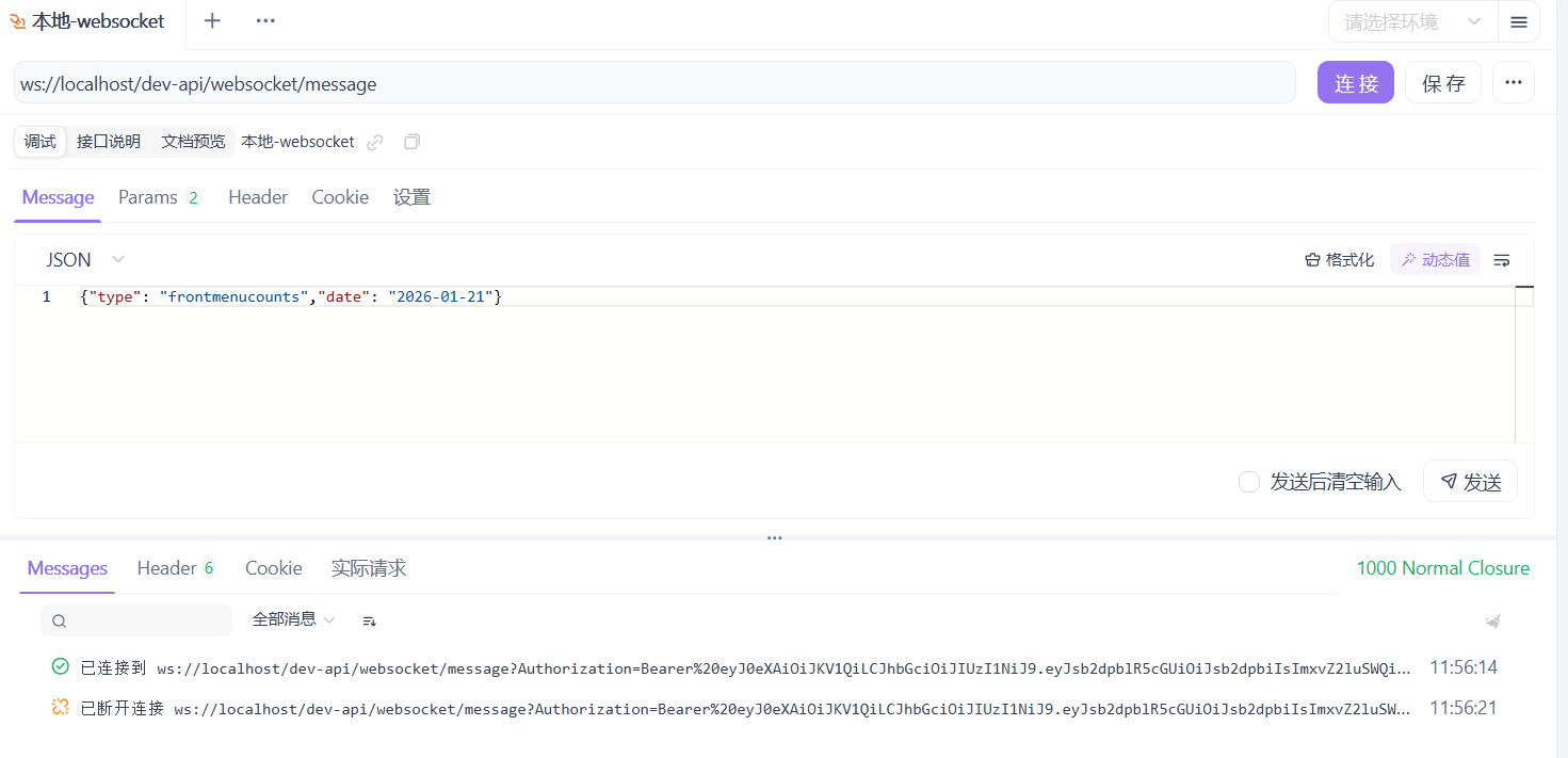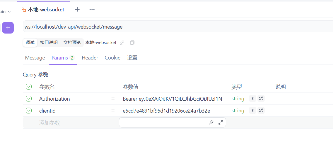 ws://localhost/dev-api/websocket/message?Authorization=123456&clientid=7895