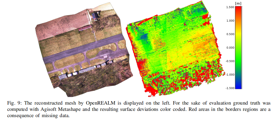 表面重建质量评估以 Agisoft Metashape 生成的结果为真值,将数据集的前向重叠率降至 80% 以控制计算时间(1 小时 45 分钟)。OpenREALM 采用 PSL 进行稠密化,实现的 GSD 为 0.15m / 单元。