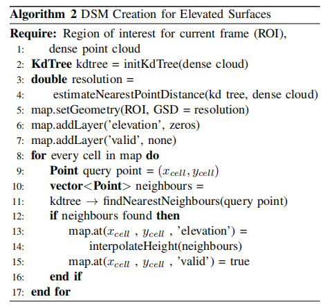 - 模式 3:基于 GNSS 定位和视觉姿态估计,利用 GPU 加速立体重建,从 RGB 图像生成 2.5D 数字高程模型。输出包括相机运动估计、各视图深度图、考虑地表高程的增量更新 2D 地图(正射影像)以及顺序扩展的稠密 3D 点云。