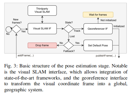 - 地理配准:若跟踪成功,将帧数据传入地理配准器,利用视觉信息和 GNSS 位置求解从局部视觉坐标系到全局地理坐标系的变换。由于需要一定数量的初始测量数据以保证计算的鲁棒性,输入帧可能会被排队,直到估计误差低于设定阈值。