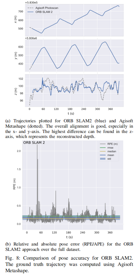 姿态估计的精度直接影响后续所有处理阶段的结果,论文以经典离线摄影测量软件 Agisoft Metashape 计算的轨迹作为真值,对 ORB-SLAM2 的姿态估计结果进行评估。