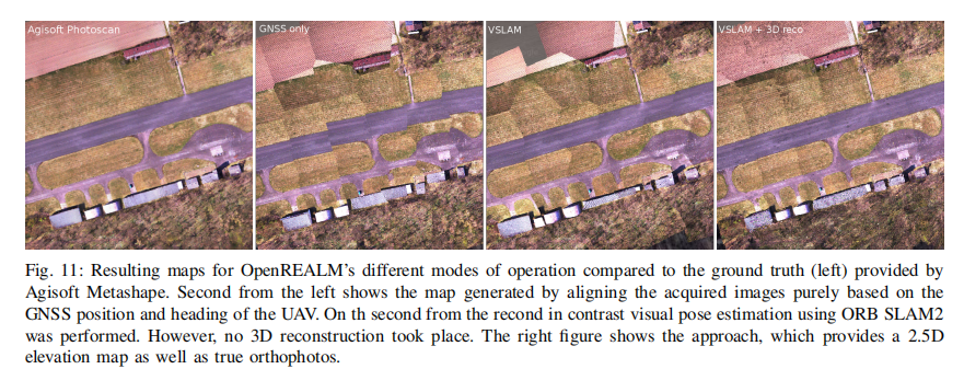 - 性能对比:尽管 OpenREALM 的重建结果仍有改进空间,但需注意其为实时处理,而 Agisoft Metashape 需要数小时的离线计算。