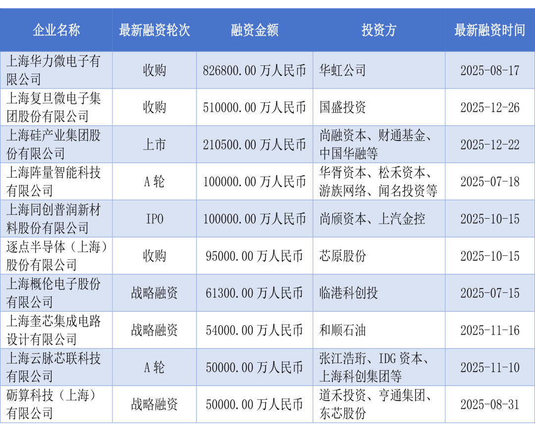 长三角地区(以上海为主)企业覆盖存储、算力核心赛道,资本认可度极高。摩尔线程作为国产GPU标杆,上市首日涨幅超500%,市场关注度拉满;中芯集成承接国内 AI 芯片、汽车电子芯片制造,致力于缓解国内先进制程产能缺口,上海市TOP10融资企业清单展示如下: