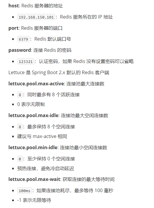 application.yml:XMLspring: redis: host: 192.168.150.101 port: 6379 password: 123321 lettuce: pool: max-active: 8 max-idle: 8 min-idle: 0 max-wait: 100ms