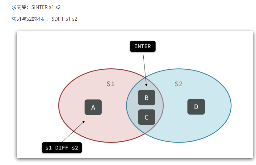 SDIFF key1 key2:求key1与key2的差集(key1中有而key2中没有)。 -