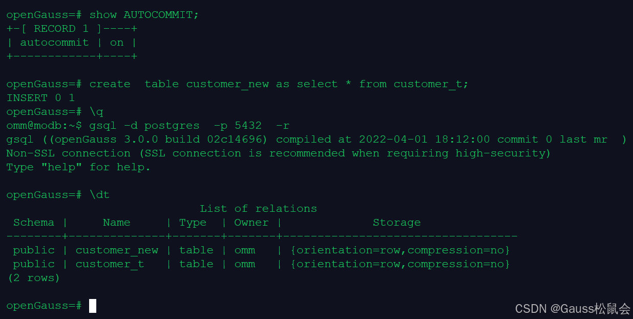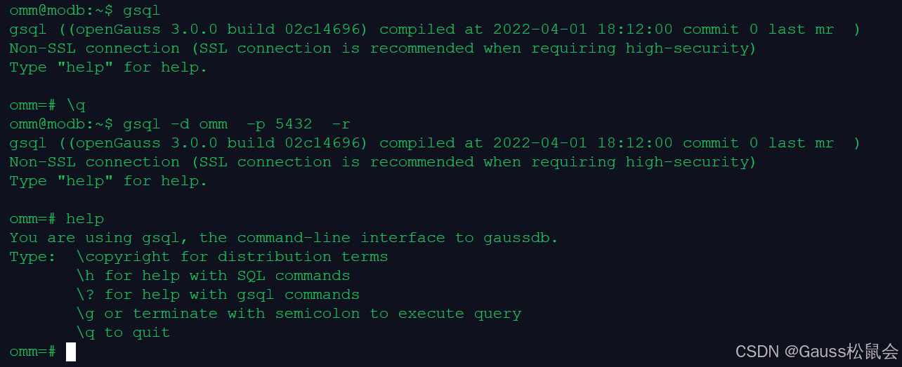 gsql 是 openGauss 提供在命令行下运行的数据库连接工具,可以通过此工具连接服务器并对其进行操作和维护,除了具备操作数据库的基本功能,gsql 还提供了若干高级特性,便于用户使用。详情可查看官方文档:工具参考 ----> 客户端工具 ----> gsql