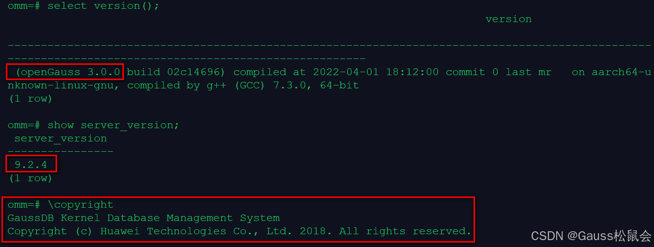 2.在 gsql 中查看数据库的版本、pg 基础版本和版权信息