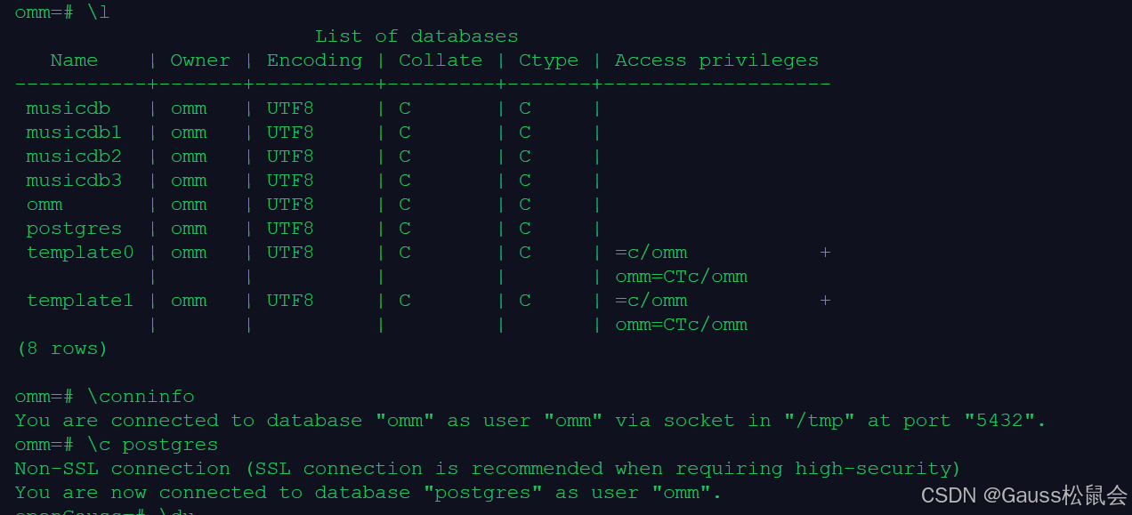 gsql -d omm -p 5432 -r