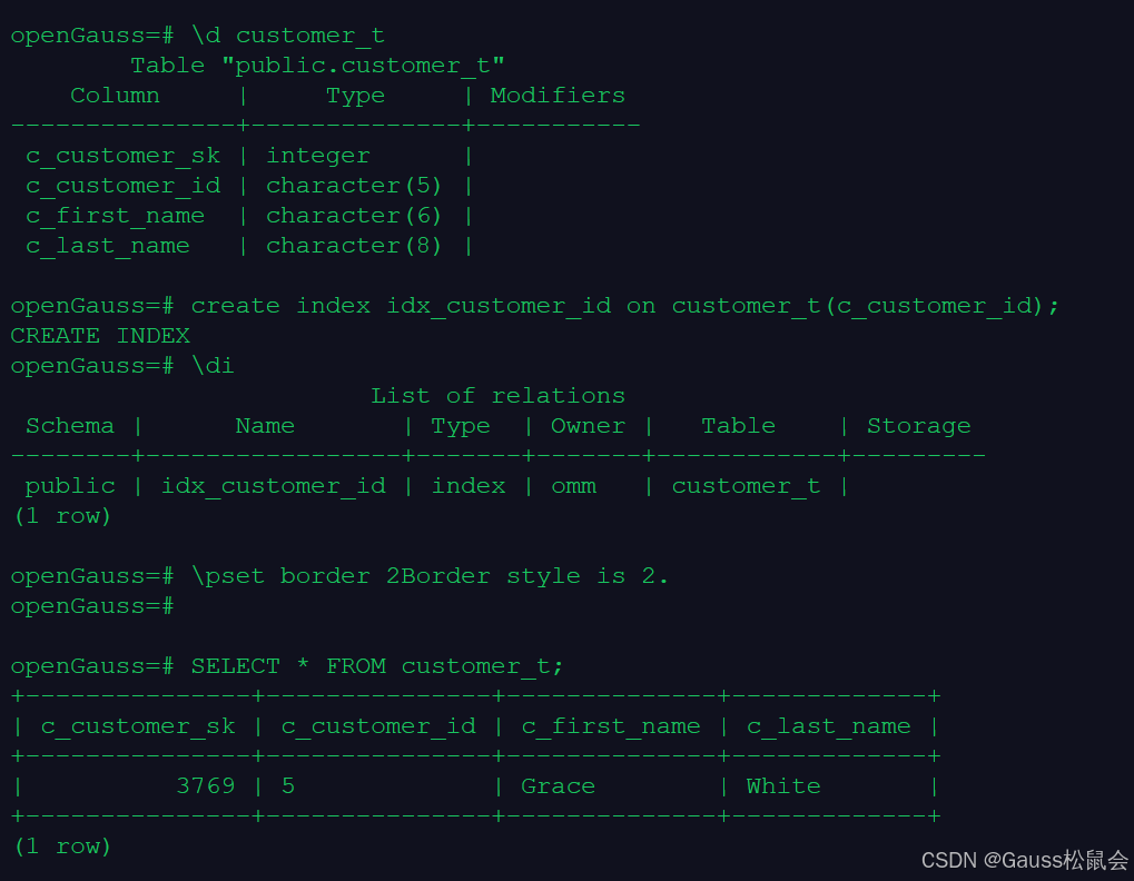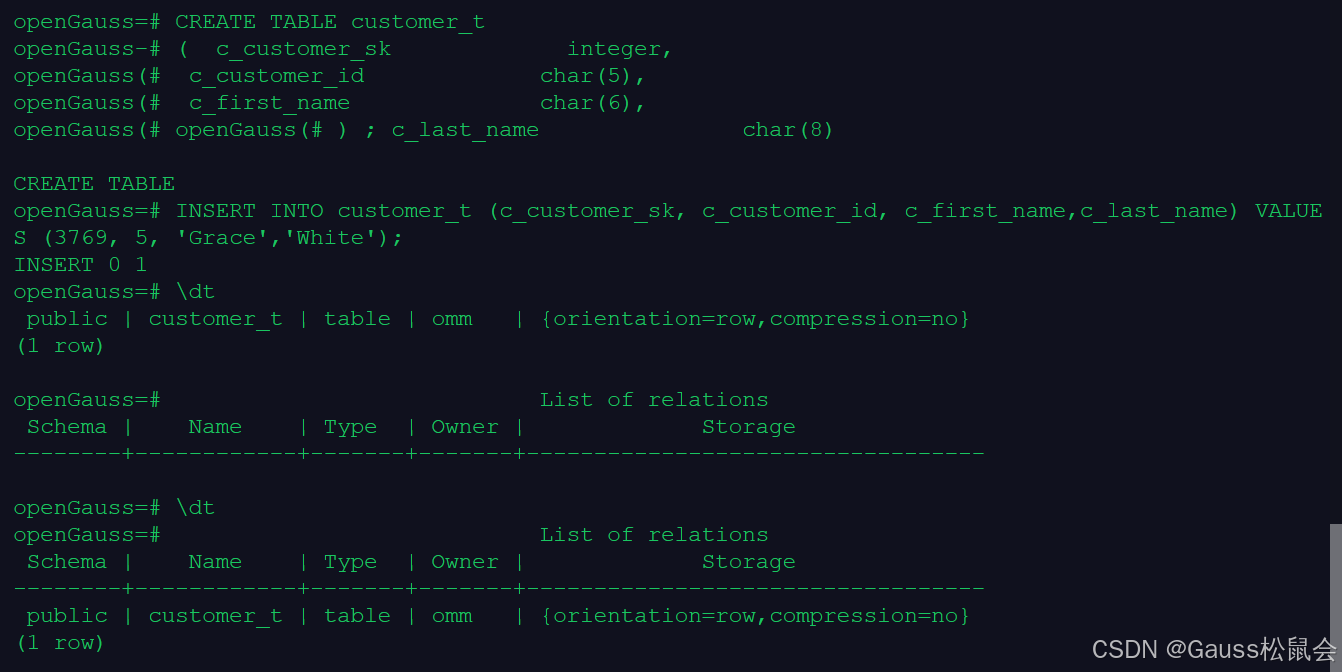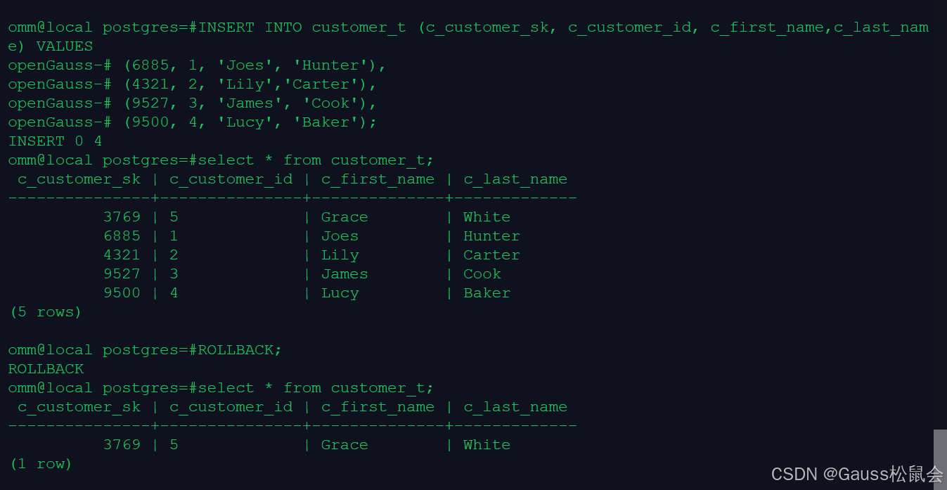 openGauss=# SELECT * FROM customer_t;