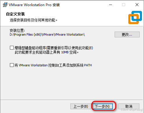 建议路径:D:\Program Files\VMware\VMware Workstation\ ,点击"下一步"继续