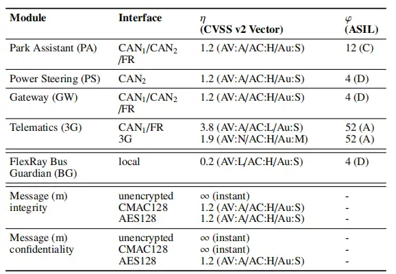 直接连接到互联网的网络或总线(如 3G)始终被视为可被利用,因为攻击者可以持续访问这些网络或总线。我们将其可利用性值恒定设为 1 以建模这一特性: